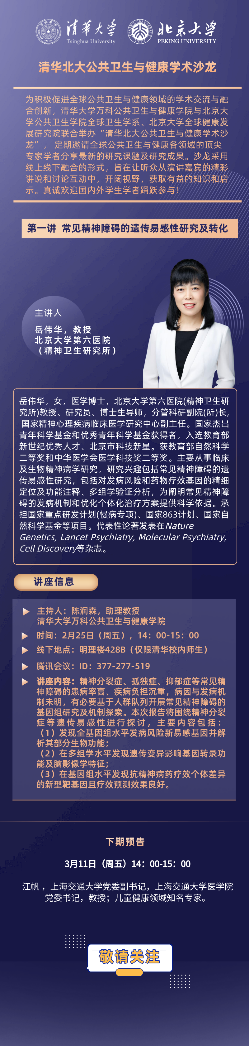 【清华北大公共卫生与健康学术沙龙】 岳伟华:常见精神障碍的遗传易感性研究及转化