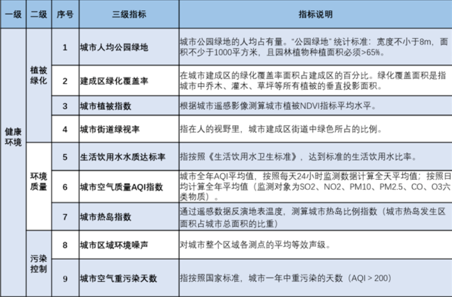 “清华城市健康环境指数”还构建了一套全面量化的规范性指标体系,涵盖3个二级指标和9个三级指标。其中,“植被绿化”板块设计了城市人均公园绿地、建成区绿化覆盖率、城市植被指数、城市街道绿视率等三级指标,从城市三维空间到居民直接感受,客观反映绿色资源的建设效果;“环境质量”领域立足空气、水、温度等健康影响要素,选取了生活饮用水水质达标率、城市空气质量指数(AQI)、城市热岛指数等三级指标;“污染控制”方面以人体生理和心理健康为考量因素,设立了城市区域环境噪声、城市空气重污染天数等三级指标。
