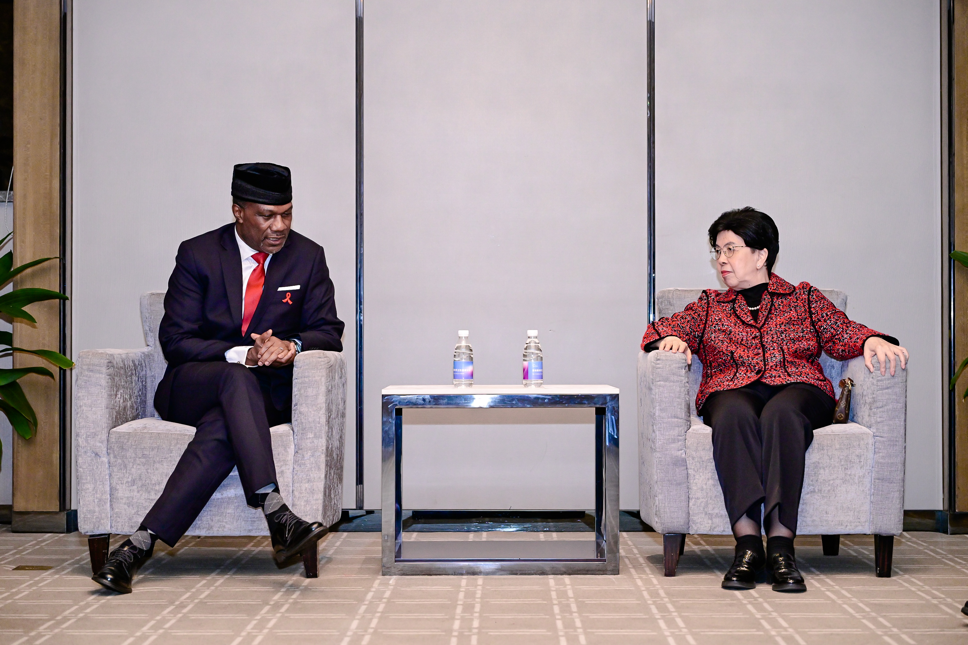创始院长陈冯富珍与联合国艾滋病规划署驻华办事处主任莫易睿(Erasmus U. Morah)共同签署谅解备忘录,开启双方合作的新篇章。