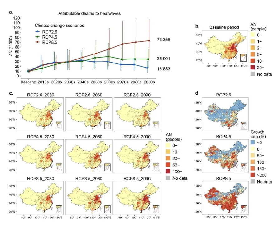 注:a,1986年至2100年三种RCP情景下的中国的热浪相关死亡人数。垂直线表示不确定性范围。b,基线期格点水平热浪相关死亡人数。c,2030年、2060年、2090年格点水平热浪相关死亡人数。d,2090年与基线期相比,热浪相关死亡人数的变化。AN,热浪相关死亡人数;RCP,典型浓度路径。
