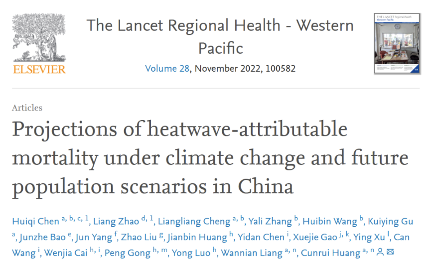 教授黄存瑞课题组在《柳叶刀-区域健康(西太平洋)》(The Lancet Regional Health – Western Pacific)上发表文章:“Projections of heatwave-attributable mortality under climate change and future population scenarios in China”。研究发现,随着全球变暖不断加剧和人口快速老龄化,即使在低排放(RCP2.6)情景下,热浪对中国人群的健康危害也将持续增加。然而,如果能实现1.5°C温升目标,预计会产生显著的健康效益。研究指出,到本世纪中叶实现碳中和是中国可持续发展的必由之路,政策制定者需充分认识到立即采取严格的气候变化减缓政策和有效的气候变化适应措施对保护人群健康的重要性和紧迫性。