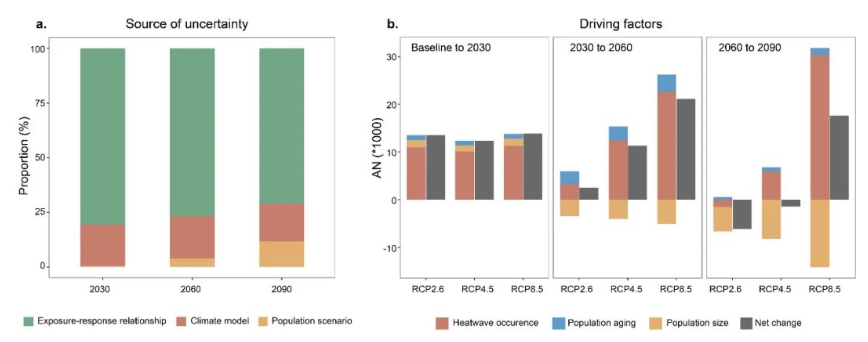 图3. 热浪相关死亡人数的不确定性来源及其变化的驱动因素