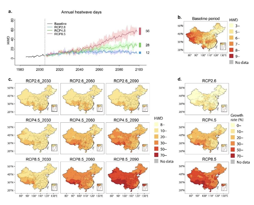注:a,1986年至2100年三种RCP情景下中国的年热浪天数。阴影区域对应于每年的热浪天数范围;黑色实线对应于基线期(1986–2005年)的趋势;右侧的彩色垂直线对应于每种情景下2090–2099年的年均最大值和最小值。b,基线期格点水平热浪天数。c,2030年、2060年、2090年格点水平热浪天数。d,2090年与基线期相比,格点水平热浪天数的变化。HWD,热浪天数;RCP,典型浓度路径。