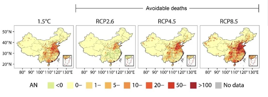 那么,在不同的气候变化和人口预测情景下,中国未来热浪相关死亡人数将如何变化?若采取更加严格的减排政策,又将获得怎样的健康收益?