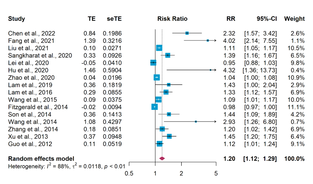 Meta分析结果进一步明确极端气温会显著增加哮喘的风险(图2和图3),高温和低温暴露下哮喘发作的相对风险分别为RR=1.07(95%CI: 1.03-1.12)和RR=1.20(95%CI: 1.12-1.29)。亚组分析结果显示,极端高温对哮喘入院的影响呈现出一周时间的短期滞后效应,而极端低温影响的滞后期相对较长,可持续3-30天。其中,老人和儿童对高温和低温表现出明显的脆弱性。