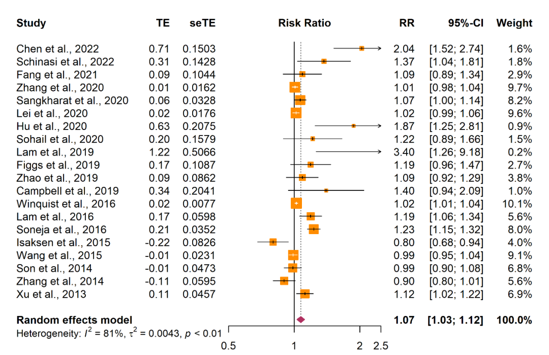 通过在PubMed,Embase和Web of Science数据库检索2022年6月30日之前公开发表的有关环境温度与哮喘发作的英文文献,共纳入111篇符合条件的研究,其中37篇定量研究被纳入Meta分析(20篇涉及高温,16篇涉及低温,15篇涉及气温变化)。