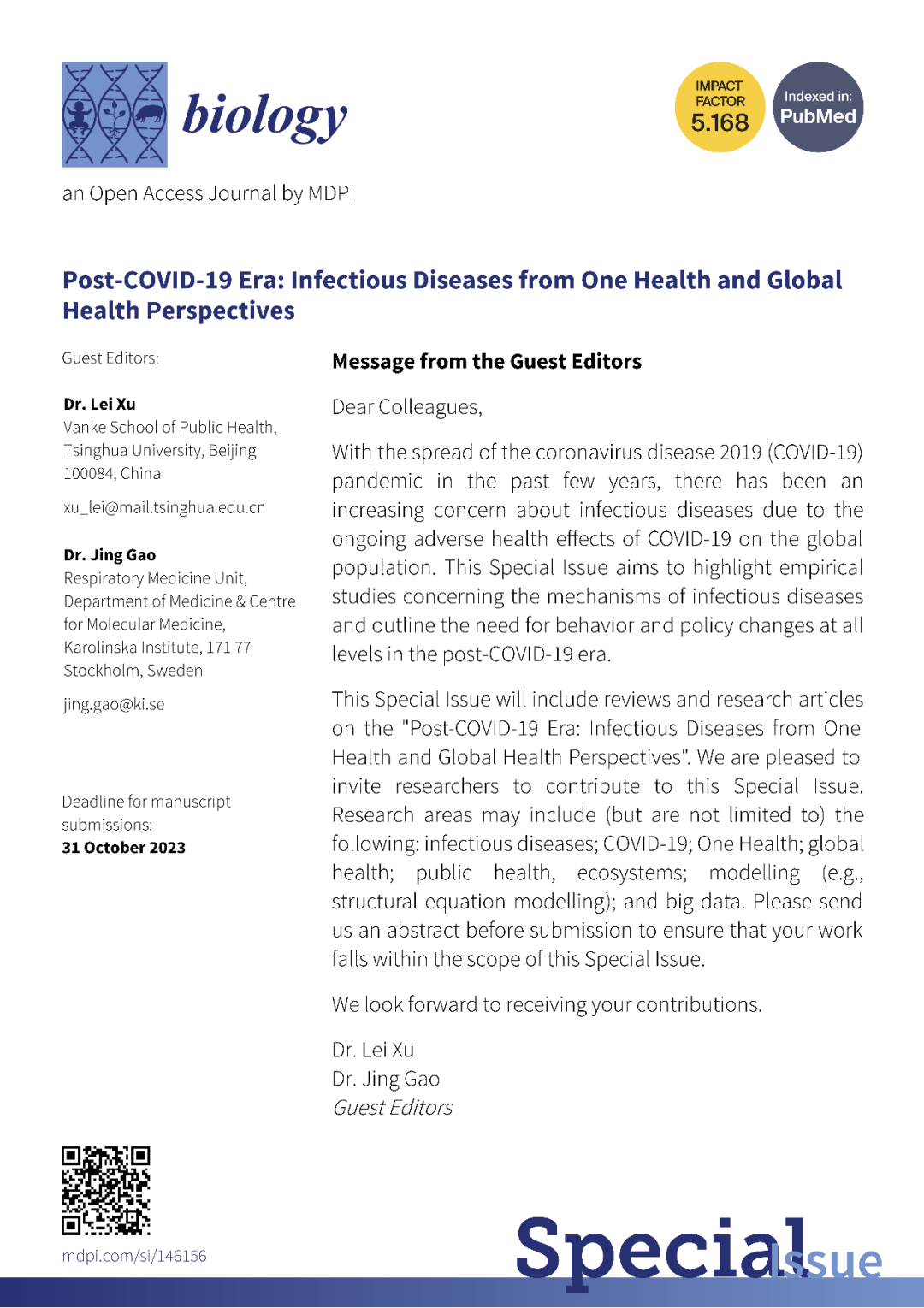 鉴于当前新型冠状病毒(COVID-19)对全球人类的健康造成了极大的不利影响,这使人们对传染病的关注日益增加,因此许磊副教授携手瑞典卡罗林斯卡医学院肺病学中心高婧研究员继续与Biology期刊合作,共同创建主题为《后COVID-19时代:从大健康和全球卫生视角看传染病研究》(Post-COVID-19 Era: Infectious Diseases from One Health and Global Health Perspectives)的特刊,旨在继续进行传染病机制的实证研究,并对后新冠肺炎时代各级行为和政策改变的必要性进行讨论。欢迎投稿。