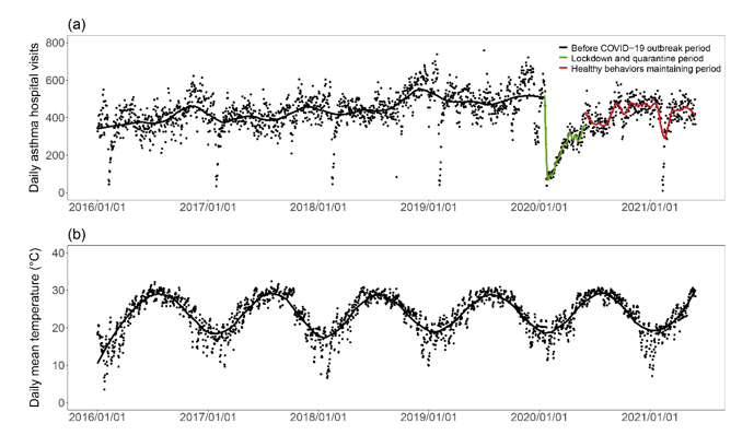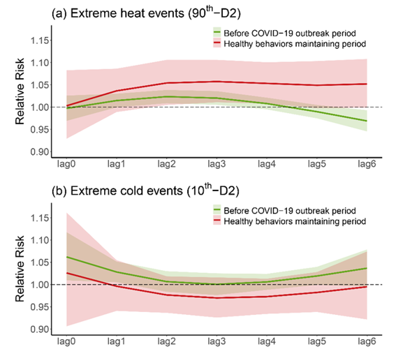 研究发现,热浪和寒潮事件会显著增加哮喘发作的风险,且事件的持续时间越长、极端程度越高,导致哮喘发作的风险越大。相较于夜间气温,白天的极端气温暴露更容易造成哮喘发作的风险。从季节初期到末期,极端气温导致的哮喘发作风险依次降低,发生在暖季或冷季初期的极端气温对哮喘发作的影响最大。疫情期间佩戴口罩等行为改变因素,虽然可能增加了热浪相关的哮喘风险,但却有助于降低寒潮导致的哮喘风险。