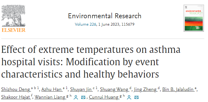 教授黄存瑞课题组在Environmental Research期刊上发表题为“极端温度对哮喘就诊的影响:事件特征和健康行为的修饰作用”(Effect of extreme temperatures on asthma hospital visits: modification by event characteristics and healthy behaviors)的论文。