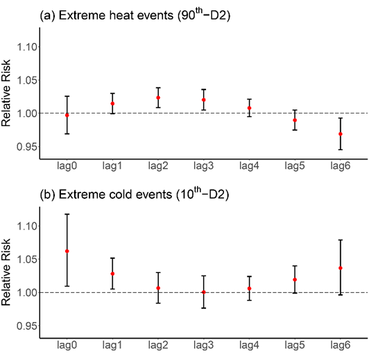 图2极端温度事件与哮喘就诊的滞后效应
