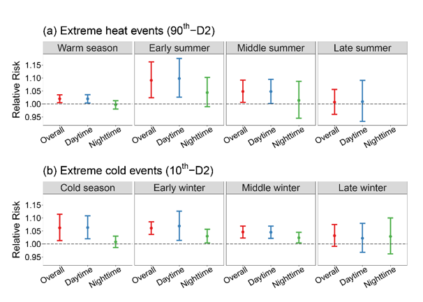 由于尚未适应温度变暖或变冷,哮喘患者可能对发生在季节早期(暖季5-6月,冷季11-12月)的热浪或寒潮更敏感。从季节的早期到后期,热浪和寒潮导致的哮喘就诊的风险逐渐降低(图4),这可能跟季节中后期人们充分利用空调、及时增减衣物等适应性行为有关。另一方面,白天发生的极端温度事件对哮喘就诊的影响更大,白天人们室外活动增加,暴露于环境中极端气温的时间增多,受影响程度更高。
