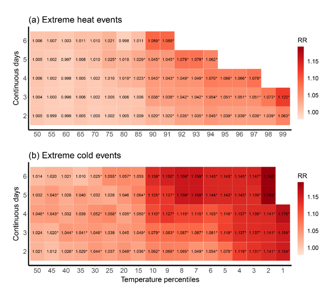 持续多日的极端温度事件对人类健康的影响更为强烈,可能造成额外的哮喘风险。热浪、寒潮导致的健康效应受持续时间、事件强度等因素影响,甚至因事件出现在一天内的不同时段或不同的季节而有所不同。既往研究大多发现极端温度事件与哮喘发作存在关联,但仍缺少对导致哮喘风险的事件特征的准确刻画,需进一步明确具有什么样持续天数和强度阈值的热浪、寒潮事件造成的哮喘风险更高,以及事件的不同发生时间又将如何影响到人群的健康效应?