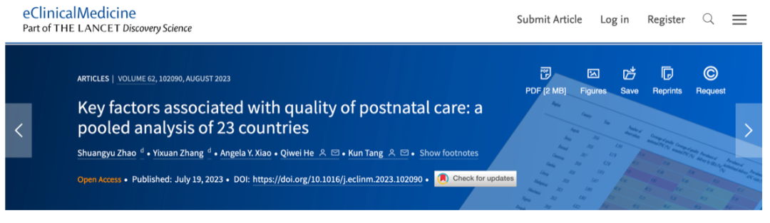 唐昆团队在柳叶刀子刊eClinicalMedicine上发表了题为《23个中低收入国家中高质量产后护理的关键影响因素》(Key Factors Associated with Quality of Postnatal Care: a pooled analysis of 23 countries)的研究文章,分析了针对妇女和新生儿的高质量PNC的覆盖率及与社会经济因素之间的关系。该研究得到拷贝漫画