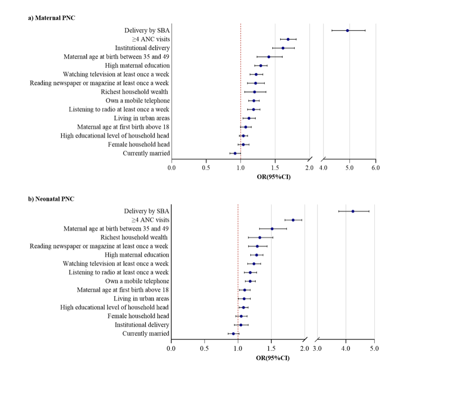 图2:高母亲教育水平表示女性接受了中等教育或以上的教育;户主高教育水平表示该女性家庭户主接受了中等教育或以上的教育;PNC表示产后护理;ANC表示产前护理;SBA表示熟练的分娩助产士;OR表示比值比。
