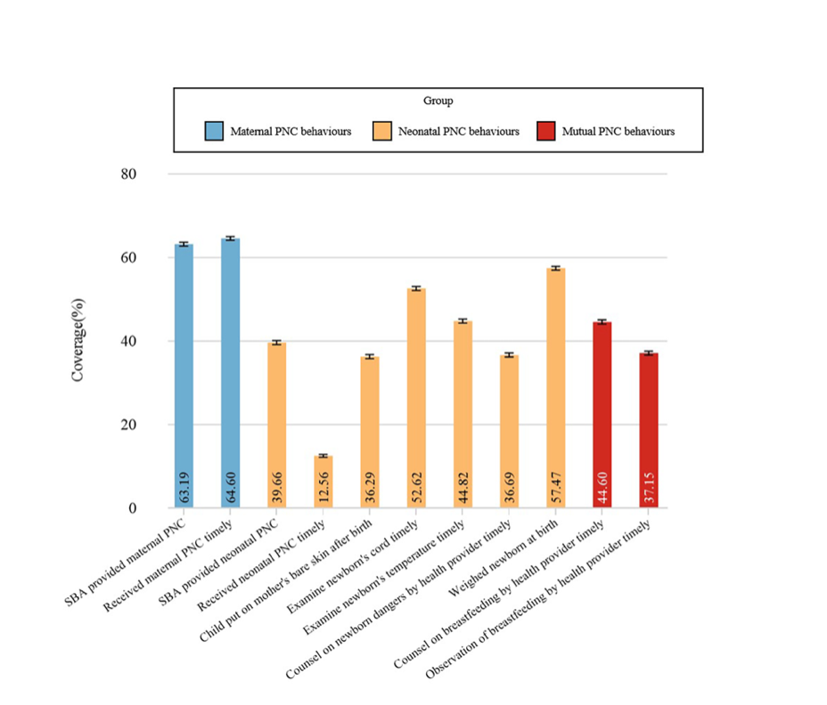 图1:针对母亲、新生儿以及双方共同开展的产后护理行为的覆盖率。(Received maternal PNC timely 指母亲在分娩后的两天内及时接受产后护理;Received neonatal PNC timely 指新生儿在出生后的两天内及时接受新生儿护理;Examine neonate’s cord timely 指新生儿出生后的两天内及时检查脐带;Examine neonate’s temperature timely 指新生儿出生后两天内及时检测体温;Counsel on neonate dangers by health provider timely 指母亲在分娩后的两天内及时接受医护人员对新生儿危险症状的咨询;Counsel on breastfeeding by health provider timely 指的是母亲在分娩后的两天内及时接受医护人员关于母乳喂养的咨询;Observe breastfeeding by health provider timely 指医护人员在分娩后的两天内及时观察母亲哺乳情况;PNC 指的是产后护理;SBA 指的是熟练分娩助产士。)