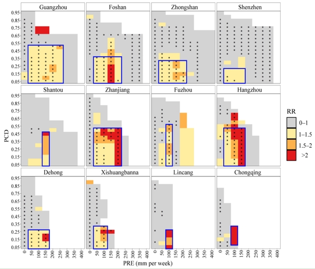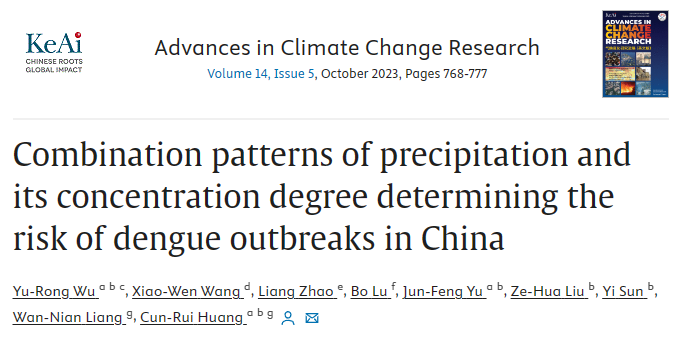 黄存瑞教授课题组在《气候变化研究进展(英文版)》(Advances in Climate Change Research)上发表文章:“Combination patterns of precipitation and its concentration degree determining the risk of dengue outbreaks in China”。研究采用降雨量和降雨集中度两个变量刻画降雨模式,结果发现在同一降雨量水平上,较低的降雨集中度(如均匀分布的分散型降雨)造成的登革热风险较高,高度集中的降雨(如瞬时强降雨)会降低登革热的传播风险。此外,研究还识别了能够引起高登革热风险的降雨量和降雨集中度阈值,并且发现在中国登革热的主要流行区域,分散降雨模式改变所引起的登革热风险正在上升。