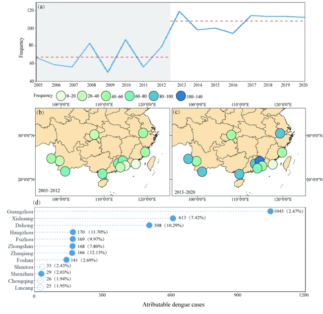 图4 (a) 12城市总计高风险降水事件的年际分布; (b-c) 高风险降水事件的地理分布;(d) 高风险降水事件所致登革热的病例数