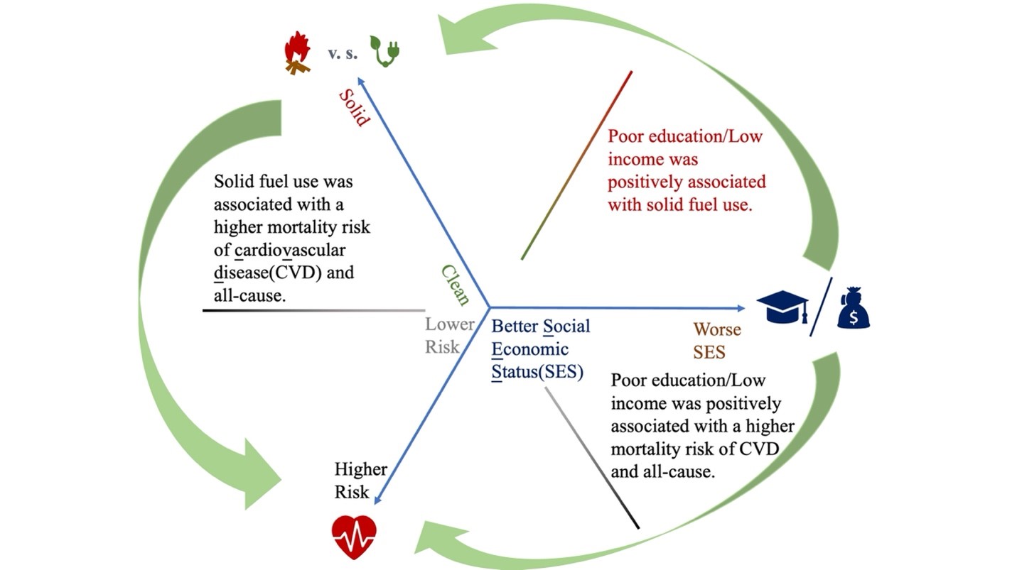 在中介效应分析中,研究发现低教育水平对全因死亡率的影响中,42.4%可以由用于烹饪的固体燃料解释,81.1%可以由用于冬季取暖的固体燃料的使用解释。而用于烹饪和取暖的固体燃料也可以分别解释55.2%和76.0%的低收入水平对全因死亡率的影响。研究还发现,在使用固体燃料的人群中,后期停用或改用清洁燃料的人群有更低的心血管疾病和全因死亡风险。这一发现将有助于制定更加精准的扶贫政策——为避免人群因贫困致病而陷入贫困陷阱,改善家庭燃料使用情况或许是一个低成本但有效的解决办法。