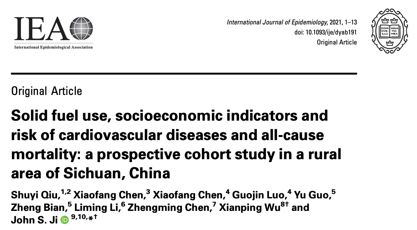副教授纪思翰(John S. Ji)教授及其团队与四川省疾病预防控制中心在《国际流行病学杂志》(International Journal of Epidemiology)合作发表文章“固体燃料使用、社会经济因素和心血管疾病及全因死亡率:基于中国四川农村地区的前瞻性研究”(Solid fuel use, social-economic indicators, and risk of cardiovascular diseases and all-cause mortality: a prospective cohort study ina rural area of Sichuan, China)。